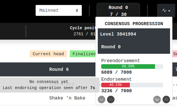 We implemented this widget to have a convenient overview of the consensus status. It provides information on whether the consensus is reached (pre/quorum) or not at each level and round. Additionally, it tells you when the quorum was reached and when the last (pre)endorsing operation was received (if there are people that are late). The progression bar is red if the quorum is not reached and green otherwise.