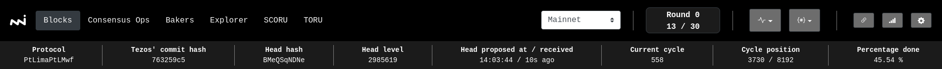 The top navigation bar is important to exploit Explorus at its peak. It allows you to navigate different pages, to switch between available networks thanks to the main selector on the right. Next to it, you have a « Tezos clock » that tracks the time and position in the current round. Before diving into the other widgets on the right, let's talk about the convenient sub-bar below that provides information about the current active protocol. Namely, the Tezos Git's commit hash that was used to generate the binaries of the currently running node, the head's hash, the current level, information about when the head was proposed, and when our node did receive it. Finally, we have some information about the current cycle.