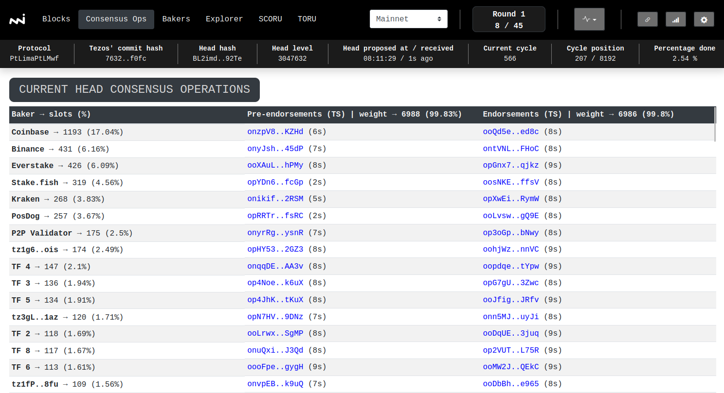 One of the main features of Explorus is the ability to observe the current, future, and past baking rights for a convenient number of levels and rounds, hence the nice view of the current state of the consensus from the bakers' perspective.